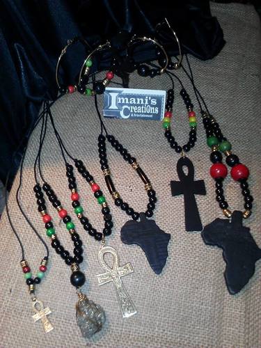 Imani’s Creations features an exclusive assortment of handcrafted Jewelry, Accessories and other divine works, artfully designed and created by Imani Scott. These original designs primarily feature semi-precious Gemstones, Crystals, Cowrie Shells, and other organic materials from Mother Earth which are accented with various sacred motifs like the Ancient Khametic(Egyptian) Ankh of Life, Queen Nefertiti, and other African “Ndinkra” Symbols, etc. Her signature line features the “Imani Shell” which is uniquely hand painted in varying designs. Custom orders are welcomed to accommodate your preferences. Selected jewelry is now available at Marilyns's NY Boutiques in Harlem, for more info CLICK HERE! for other locations click Here